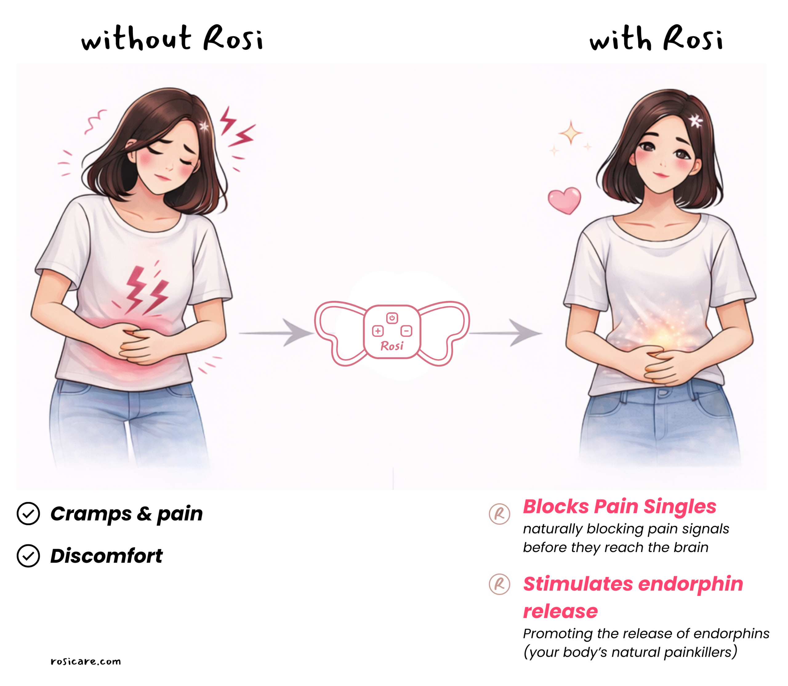 Rosi® delivers gentle electrical pulses to the lower abdomen to help calm pain signals before they reach the brain.