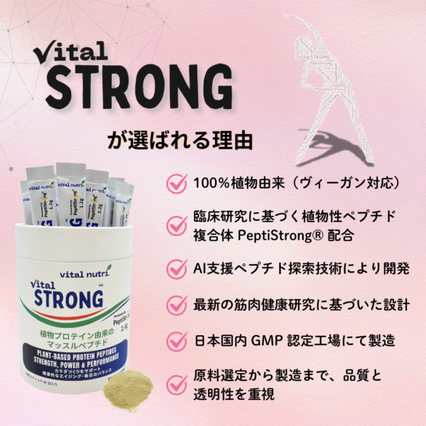 Vital STRONG™は、アイルランドの先端バイオテック企業が高度なAI技術によって発見した革新的成分「PeptiStrong®」を配合しています。臨床的エビデンスの裏付けがあり、米国FDAによるGRAS認証を取得、日本の認定GMP施設で厳格に製造されており、世界水準の品質と安全性をお届けします。